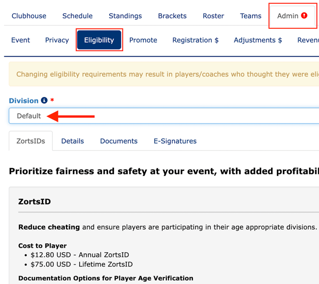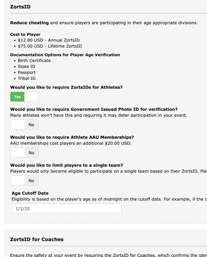 You may have a need to create division specific eligibility. Meaning, you may want the 8u division to have different required age cutoff dates for ZortsIDs than a high school division, for example.
