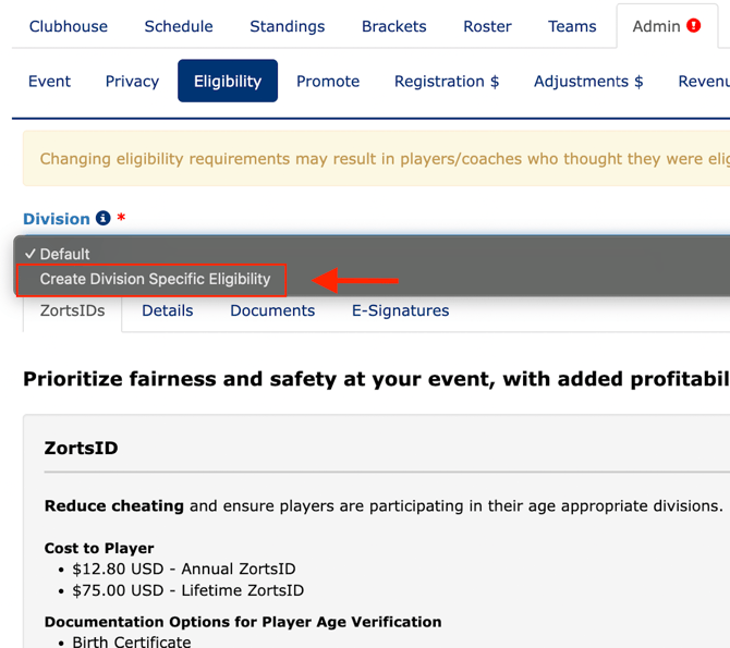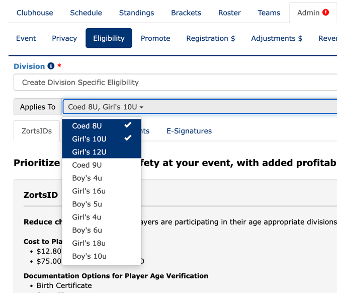 4. Scroll down and select the ZortsID eligibility you require for your selected divisions. Parents/participants will be sent a roster invite from your team coaches when they build their rosters. Once accepted, they will access their eligibility items to complete and will be prompted to purchase a ZortsID that is reviewed by Zorts staff within 1-5 days.