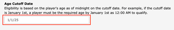 5. Enter the cutoff date you’d like to be applied to the divisions selected. For example, if you’d like all participants in the 12u division to be 12 years old on or before 1/1/25, enter it here. The system will calculate the age of the participant based on their valid ZortsID and flag any ineligible participants. The status of the participants who are ineligible due to age will say “invalid age” and the parent, participant, coach, and Event ADMIN will see that status.
