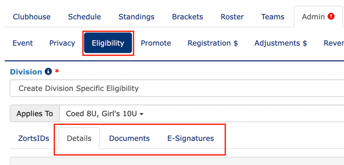 6. Navigate to the remaining three tabs under 'Admin' > 'Eligibility' labeled 'Details', 'Documents', and 'E-signatures' to adjust eligibility settings for the currently selected divisions.