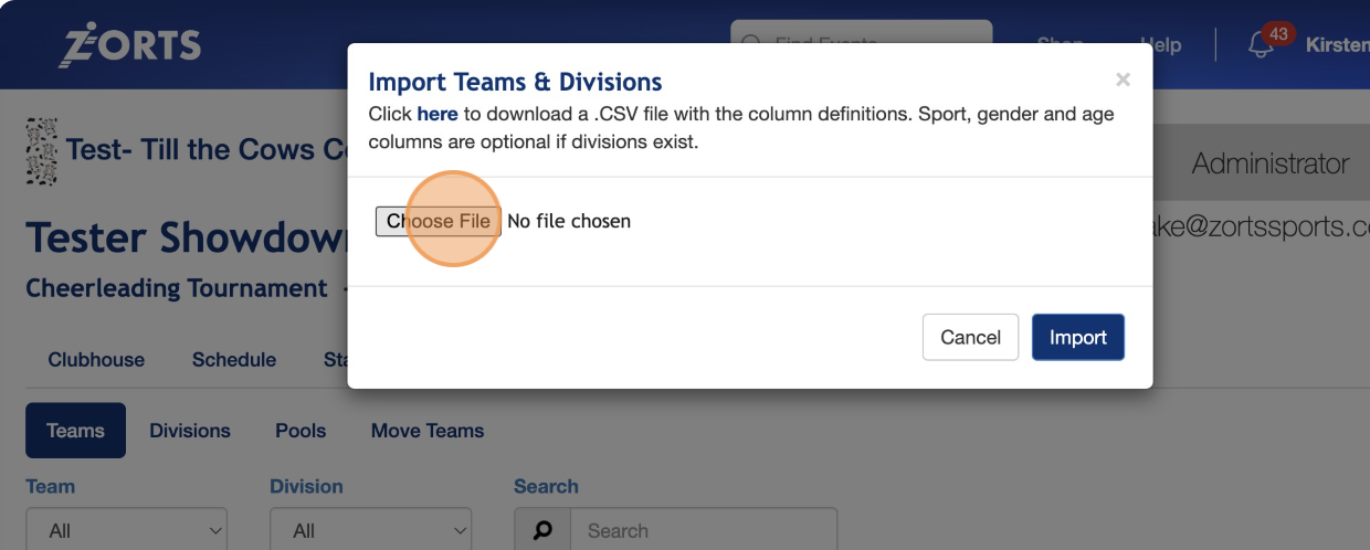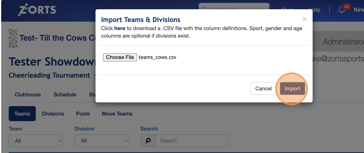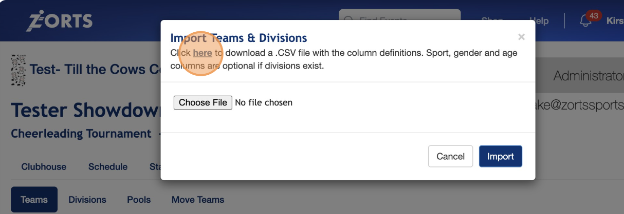 6. Click 'Here' to download a template (if needed) that you may fill out to import your teams with.