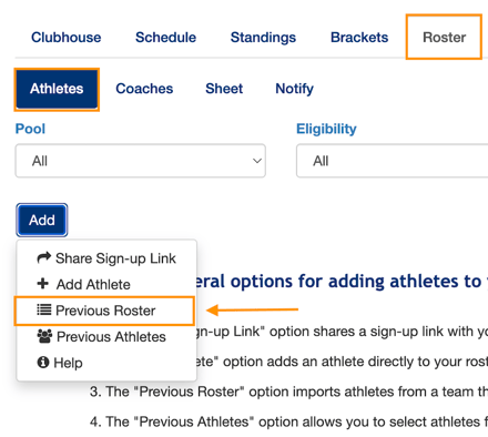 The coach or club admin may import a previously used roster to the current event.