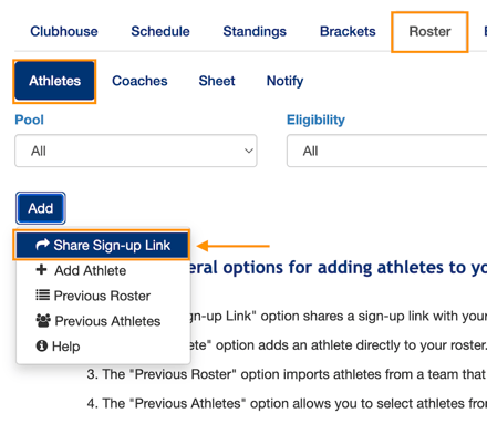 The coach or club admin may share a sign-up link to the roster for the event.