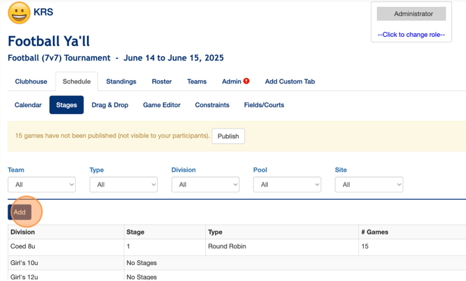 1. After logging into your account and selecting your event, navigate to the 'Schedule' > 'Stages' tabs and click 'Add'.