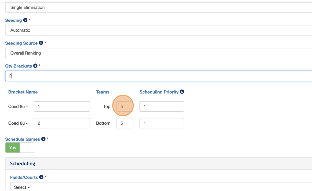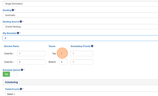 5. For this example, we are making TWO brackets. Now enter the number of teams that you would like to be in the 'Top' bracket and the 'Bottom' bracket.