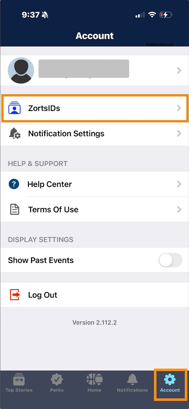 1. Log into your account and click 'Account' at the bottom right. Then, click 'ZortsIDs'