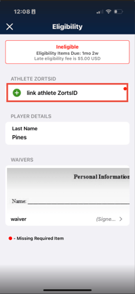 1. After logging into your Zorts account on the app, and selecting the event you will be attending, you will be given a message stating that you have 'Missing Items'.