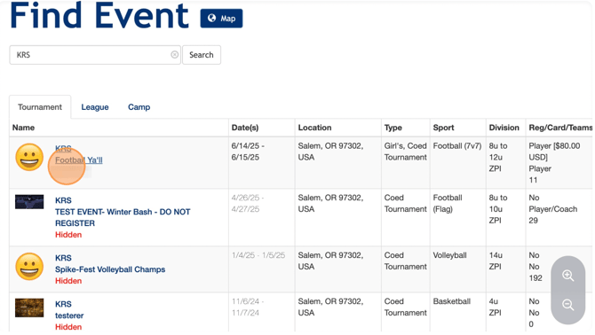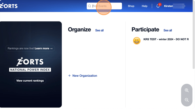 1. After logging into your Zorts account at https://zortssports.com search for the event using the event name or location.