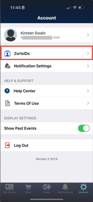 1. After logging into your account, click 'Account' at the bottom right of your screen, and then click 'Zorts Cards'