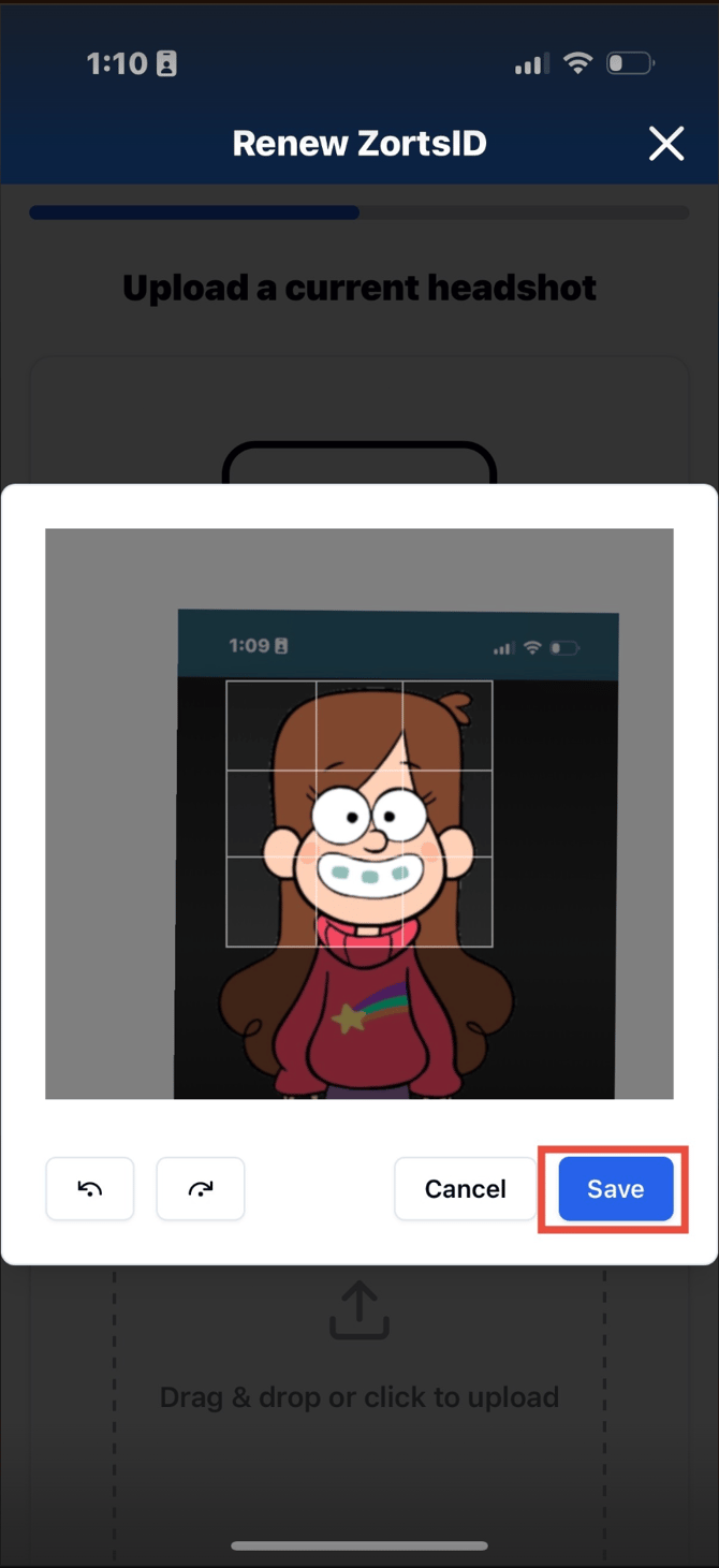 6. Once you’ve selected your photo, please zoom in to crop (if necessary) and position the face in the center of the frame. Then, click save.