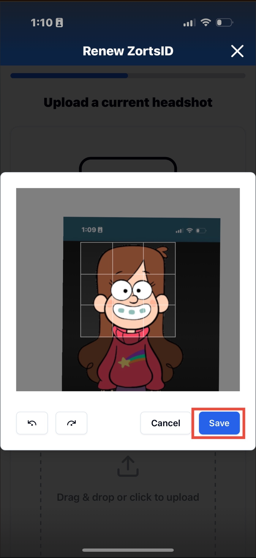9. Once you’ve selected your photo, please zoom in to crop (if necessary) and position the face in the center of the frame. Then, click save.