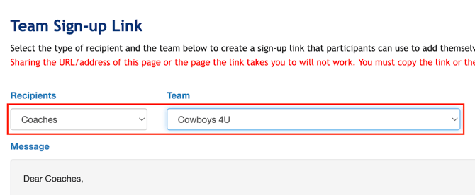 4. Select your choice of team/division and recipient for the sign-up link (Coaches).