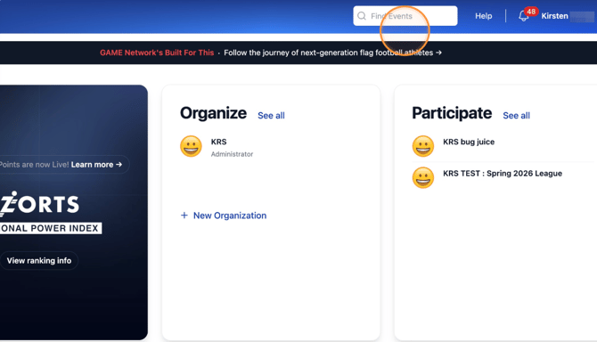 1. Click 'Find Events' and type the name of the event or the organization throwing the event