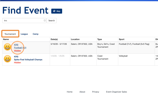 2. Select the type of event you are looking for (e.g., Tournaments).