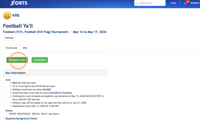 Below are step-by-step instructions on how to register your team for a new event from a web browser.