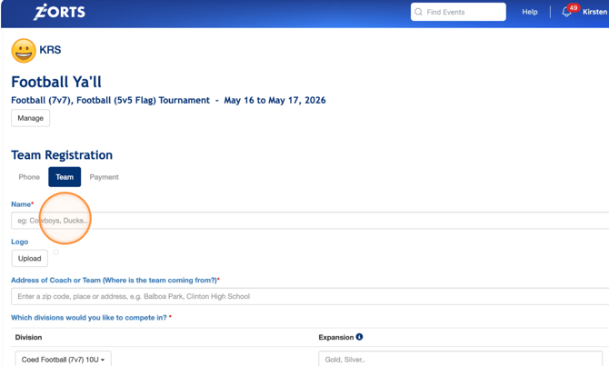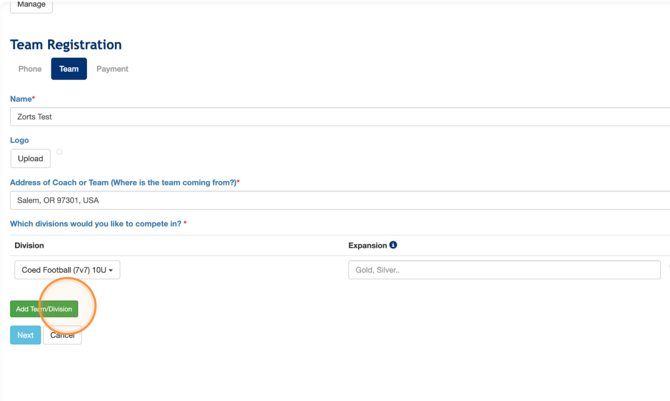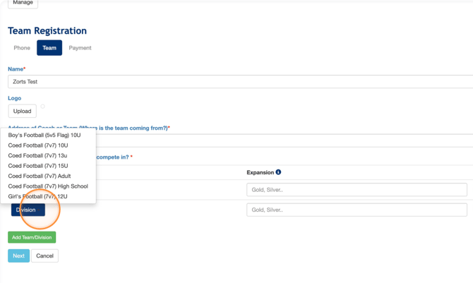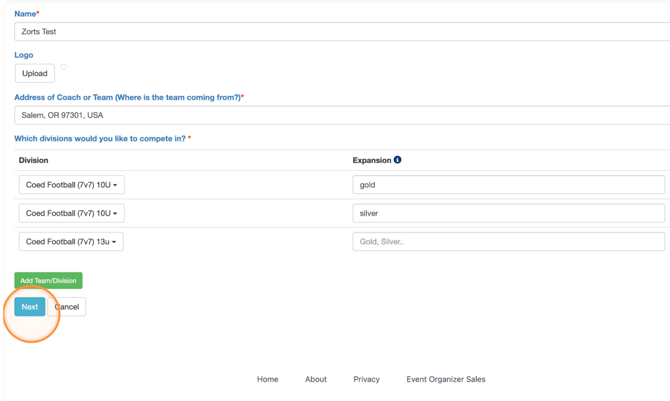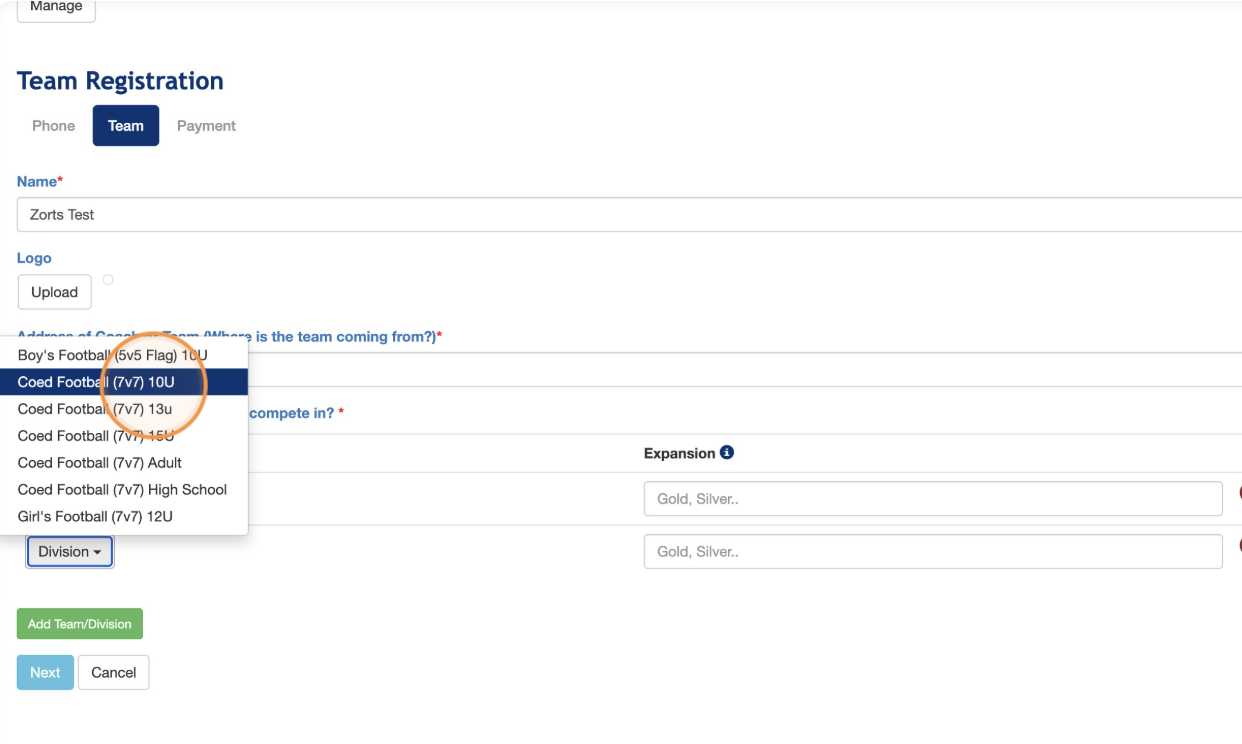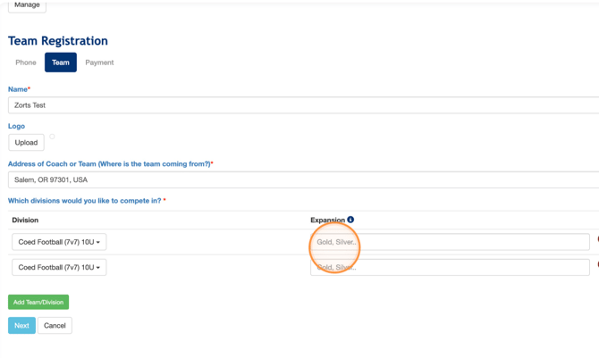9. If you have two of the same division (e.g., two coed 10U teams), be sure to differentiate them by adding an 'Expansion' name