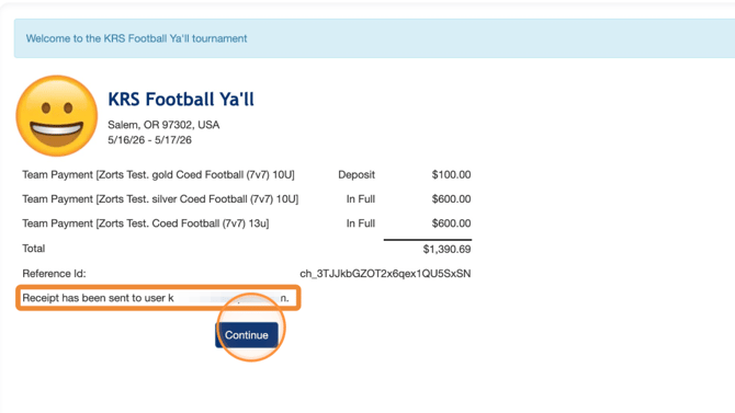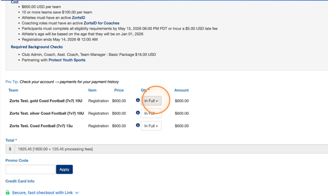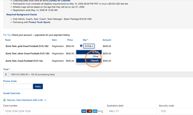 12. If you'd like to pay the deposit for one or more divisions, select 'Deposit'.